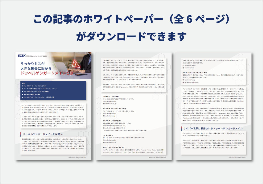このようなタイプミスに起因する紛らわしいスペルのドメインを「ドッペルゲンガードメイン」と呼び、世界中の著名な企業、団体、各種サービス等には、高確率でドッペルゲンガードメインが存在しています。このドメインは不正にメールを取得するだけでなく、攻撃目的で作成したウェブサイトに誘導するフィッシング詐欺メールなどに悪用されると言われています。 本記事では、ドッペルゲンガードメインの具体的な手口や被害事例、そして対策についてご紹介します。