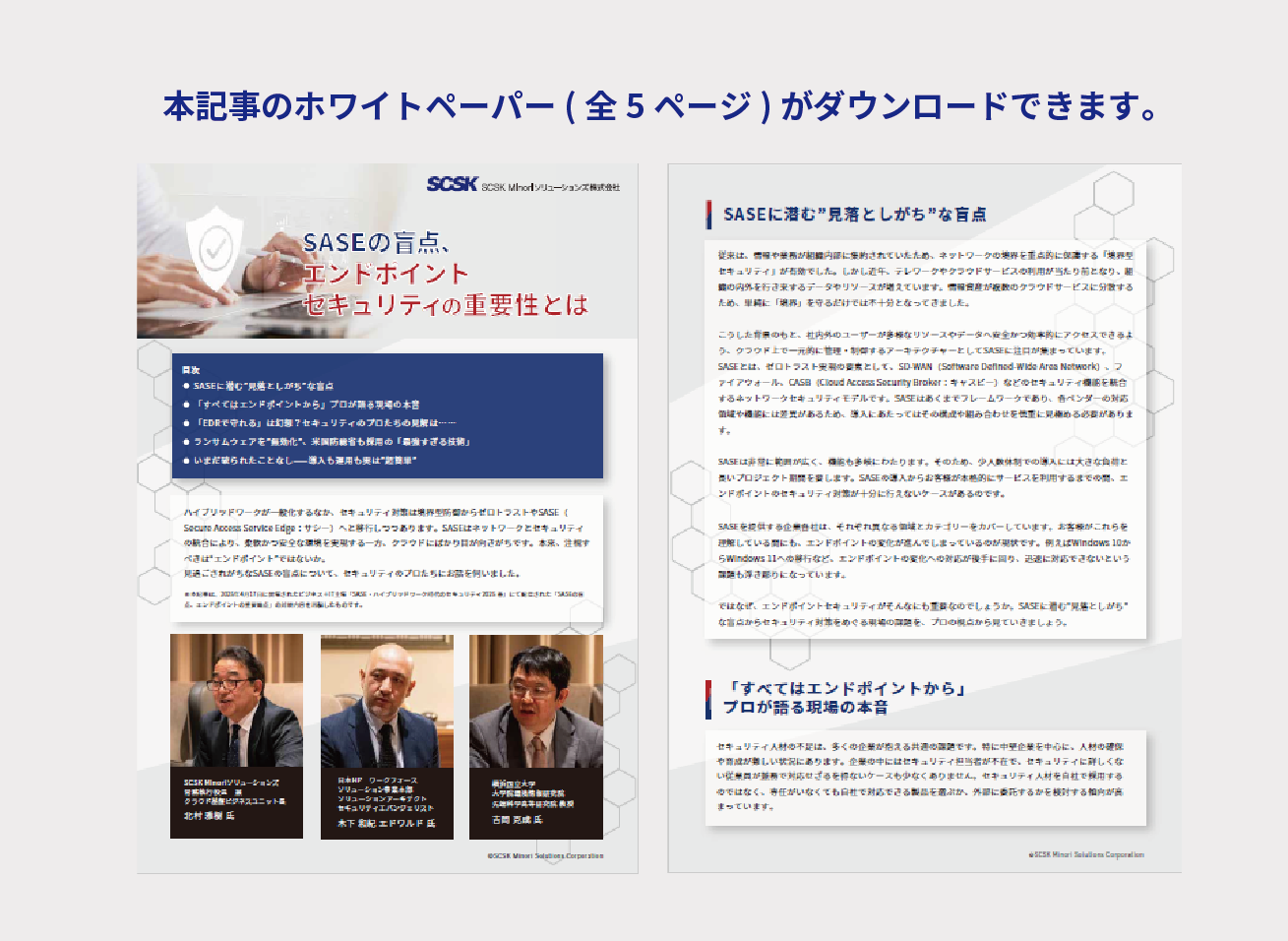 ハイブリッドワークが一般化するなか、セキュリティ対策は境界型防御からゼロトラストやSASE(Secure Access Service Edge:サシー)へと移行しつつあります。SASEはネットワークとセキュリティの統合により、柔軟かつ安全な環境を実現する一方、クラウドにばかり目が向きがちです。本来、注視すべきは“エンドポイント”ではないか。見過ごされがちなSASEの盲点について、セキュリティのプロたちにお話を伺いました。