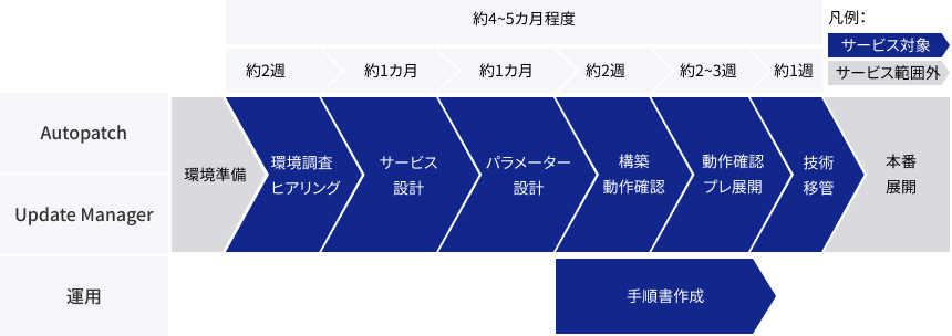 サービス詳細弊社では、本サービスを以下のような工程で進め、本番展開まで手厚く支援します。