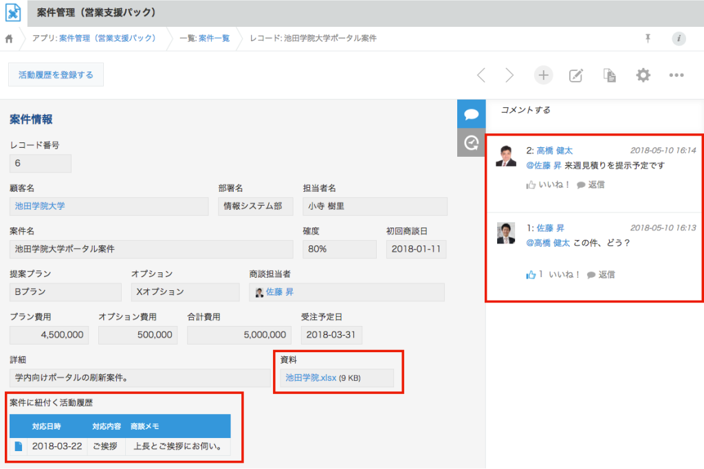 過去の対応履歴も、提案資料も、案件情報に関連するやり取りも同じ画面内で完結