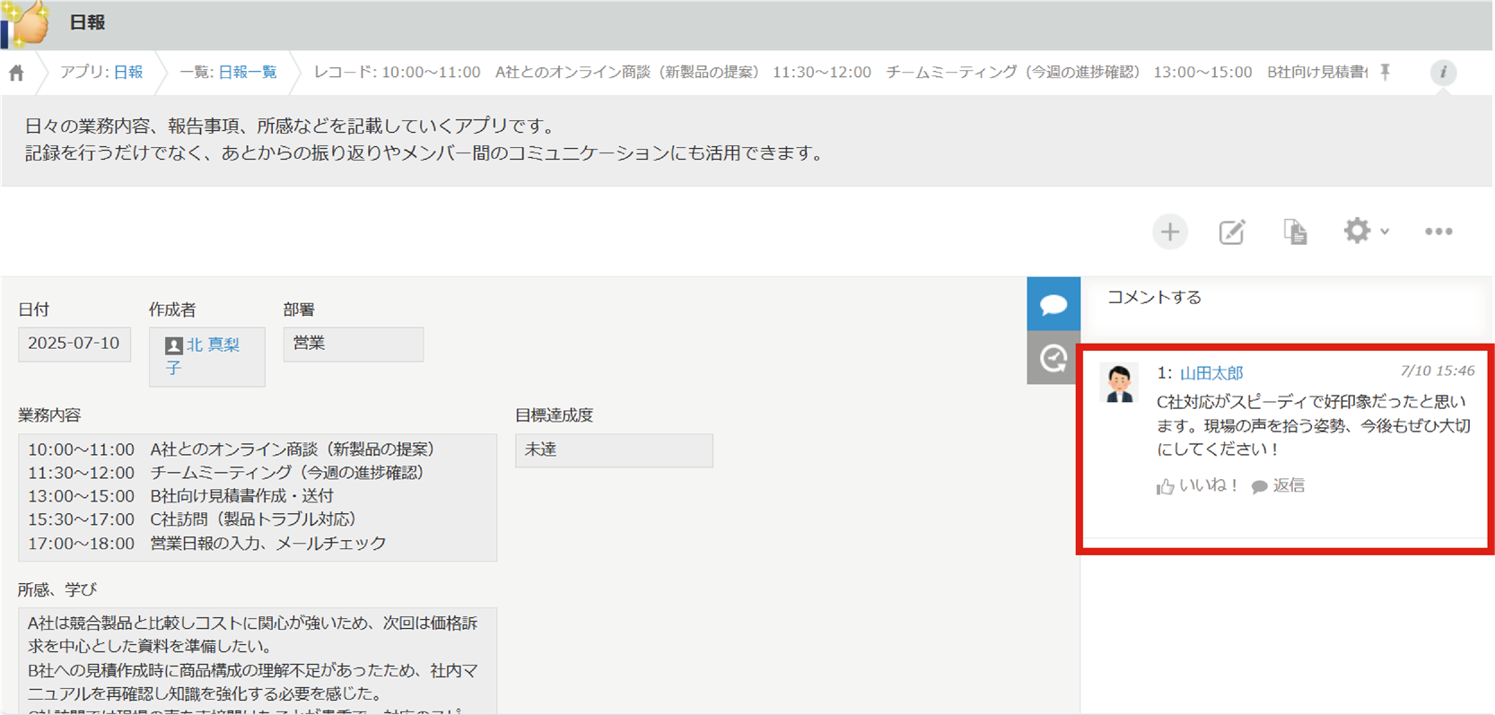 kintoneを活用すれば、日報や報告書を統一されたフォーマットで一元管理できます。入力内容は即座に関係者へ通知するよう設定することも可能です。また、コメント機能によりフィードバックがしやすくなり、チーム内での情報共有やスキルアップを促進します。さらに、スマートフォンからも手軽に入力できるため、現場での記録や報告も効率化できます。