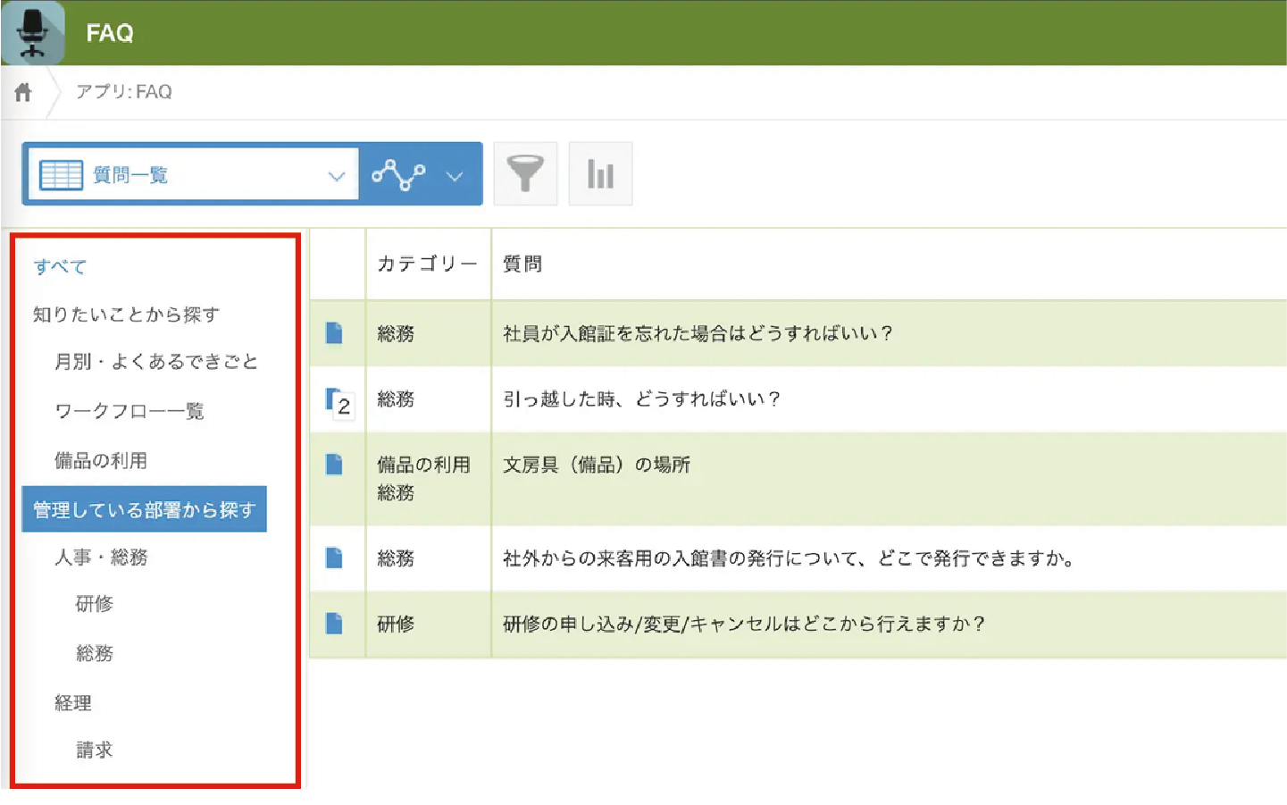 こうしたよくある質問を社内FAQとしてkintoneで公開することで、従業員は質問する前に自分で解決策をみつけられるようになります。FAQはカテゴリで絞り込んだり、キーワードで検索できるため、必要な情報にすぐアクセスでき、質問する側、回答する側の双方の工数削減につながります。さらに、検索AI機能を活用すれば、情報が複数のアプリに分散していてもAIが横断的に検索し、必要な情報をスピーディに見つけ出します。