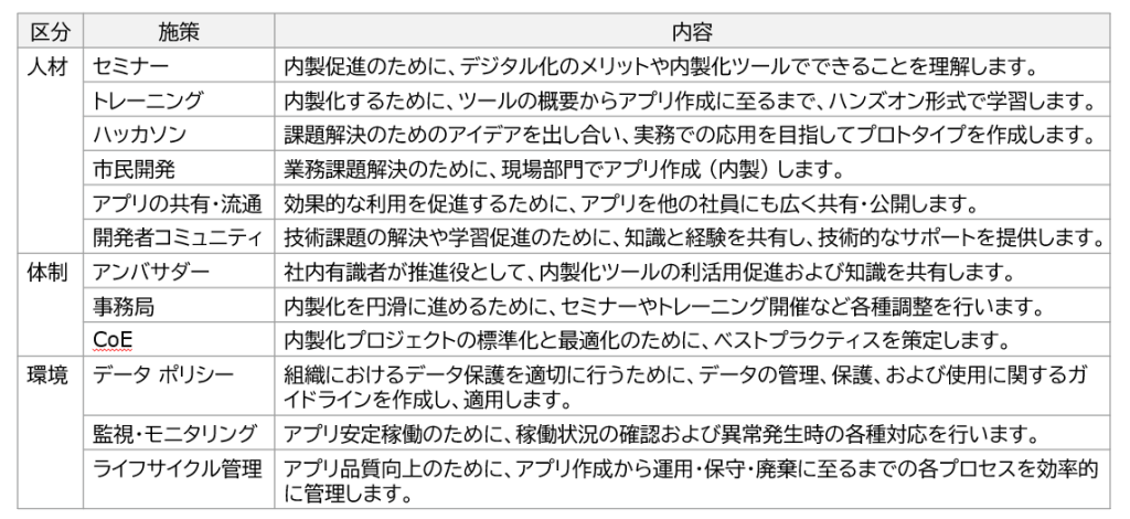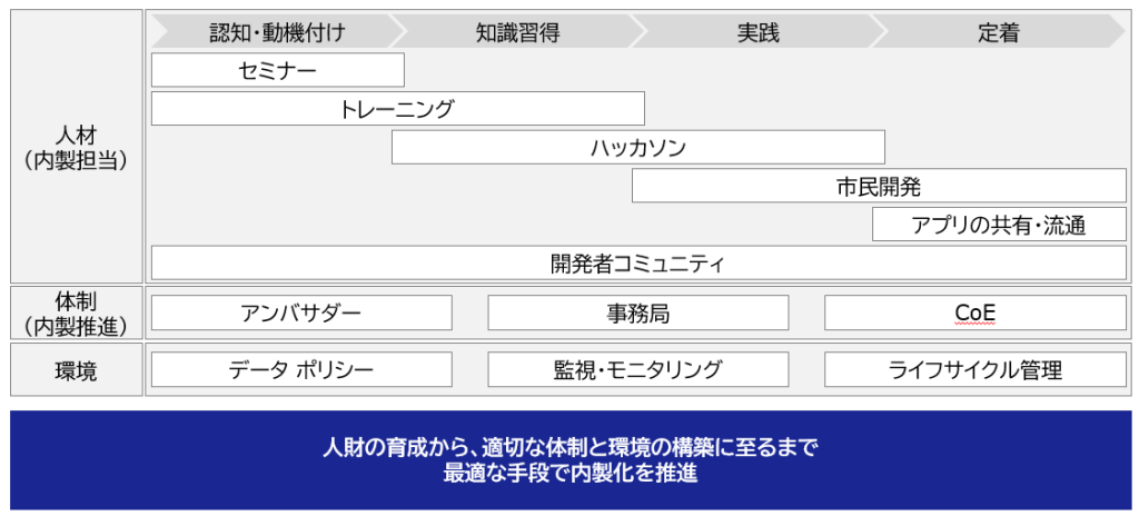 内製化実現のためには、生産性を最大化するための環境設計・構築や、ガバナンスのためのポリシー設計、ユーザートレーニングが重要になります。
